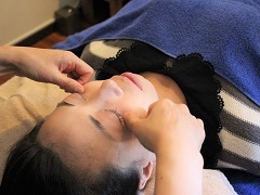 顔にあるツボを顎から頭部に向かって、繰り返し優しく刺激します。目のきわ、フェイスライン、頬骨の上、額など18か所のツボを押します。