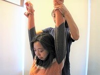 腕と肩の筋肉に再アプローチして、可動域を広げていきます。この段階では、もう身体がポカポカと温まってきているそう。